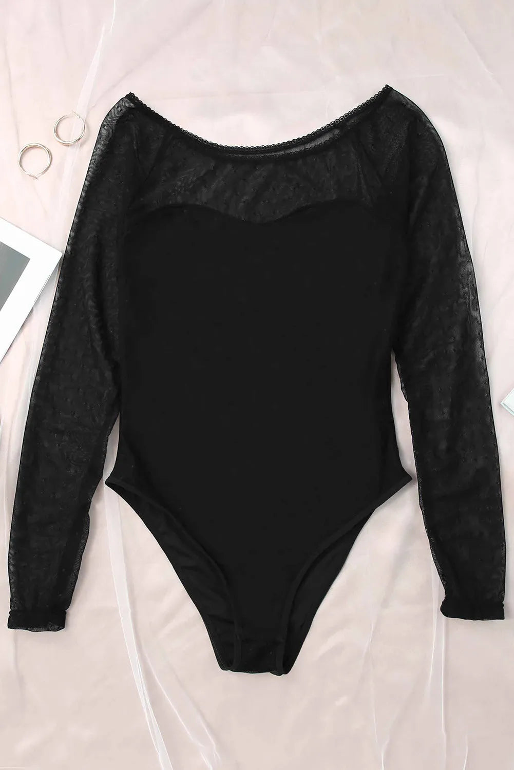 - The Dotty Mesh Overlay Long Sleeve Bodysuit features a sheer mesh overlay with a polka dot pattern, which gives it a playful and feminine look.