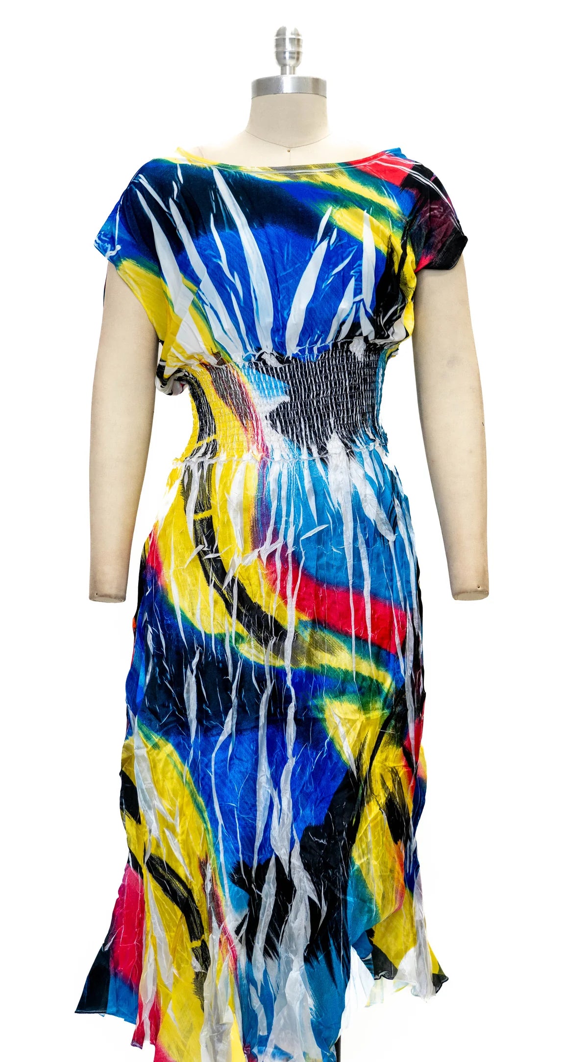 Flattering smocked waistline for all-day comfort. Flowing skirt for ease of movement. Lightweight, breathable fabric. Vibrant multi-color pattern for a playful, chic look. Perfect for casual, daytime, or semi-formal occasions.