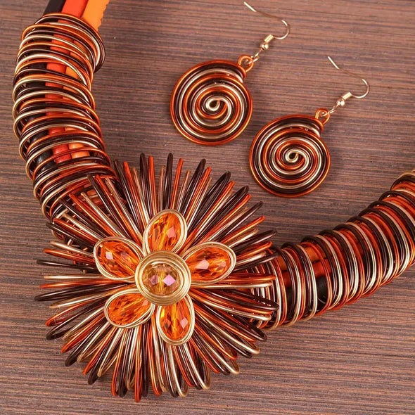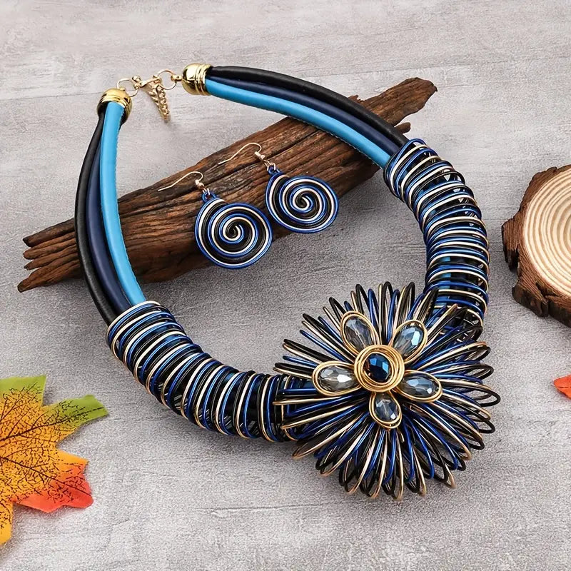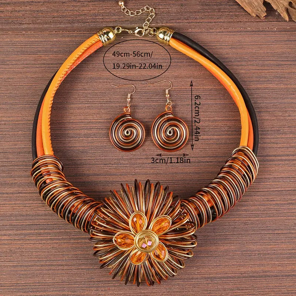This jewelry set is crafted with striking, oversized elements, featuring a vivid and colorful floral pattern.