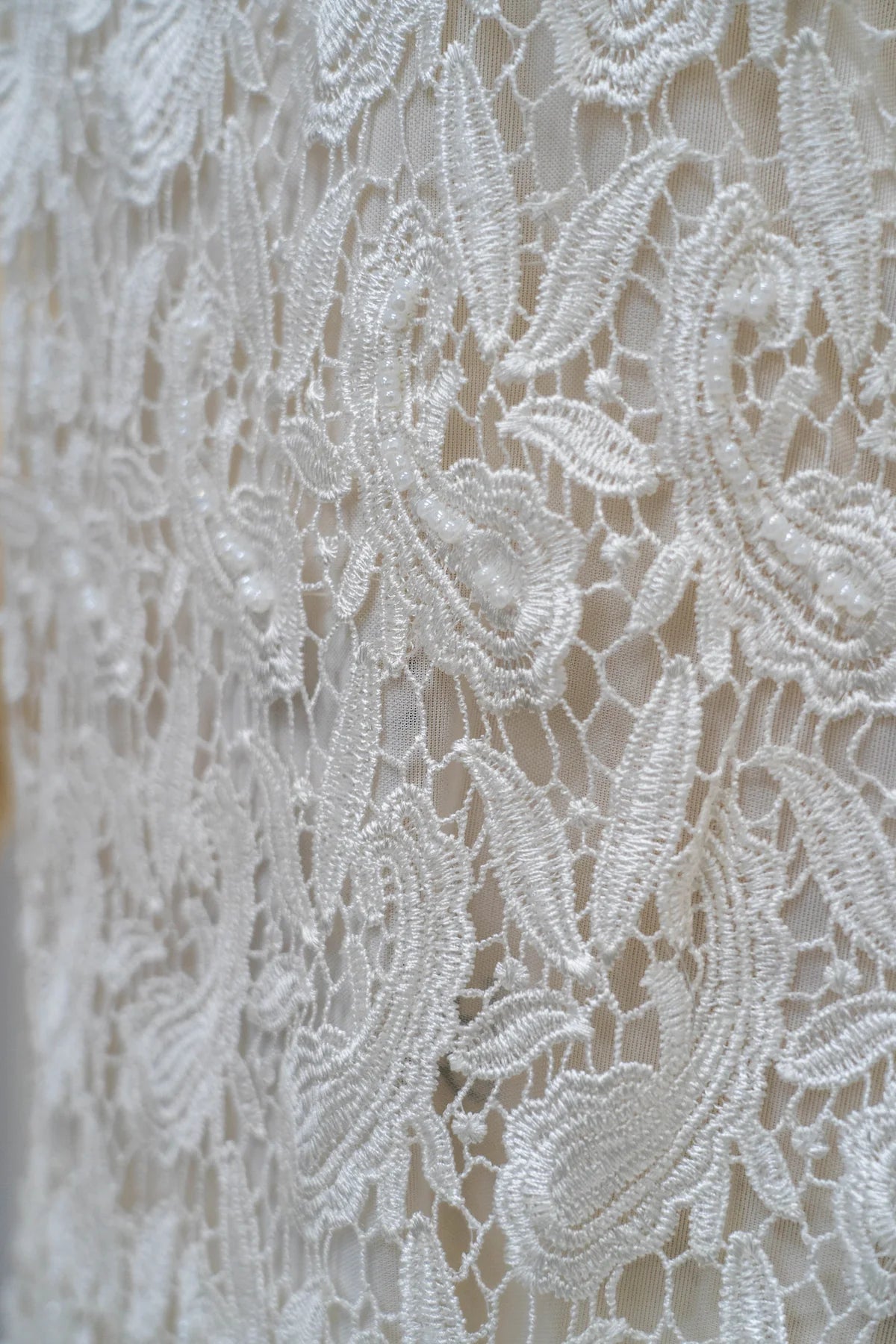 Elegant lace overlay with detailed pearl accents. Fully lined for comfort and coverage. Scalloped hem and sheer lace sleeves. Back zipper closure for a secure fit. Suitable for formal or semi-formal events.