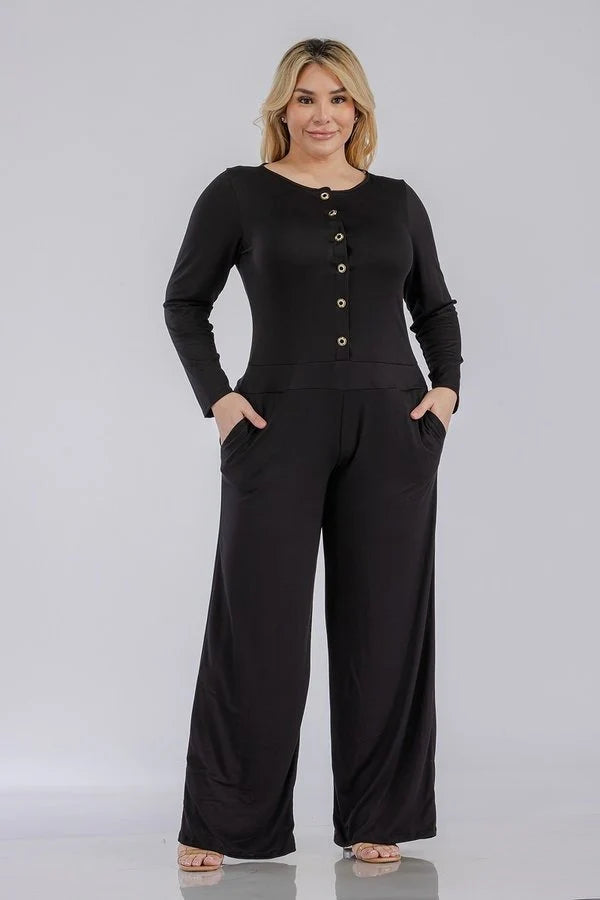 Button-down front for easy wear & tailored appeal. Long sleeves for added sophistication and versatility. Can be styled casual or dressy. Perfect for work, brunch, or evening events. “From desk to dinner, this jumpsuit does it all.” Easy fit and chic one-piece look works for workwear, date nights, and weekend outings.