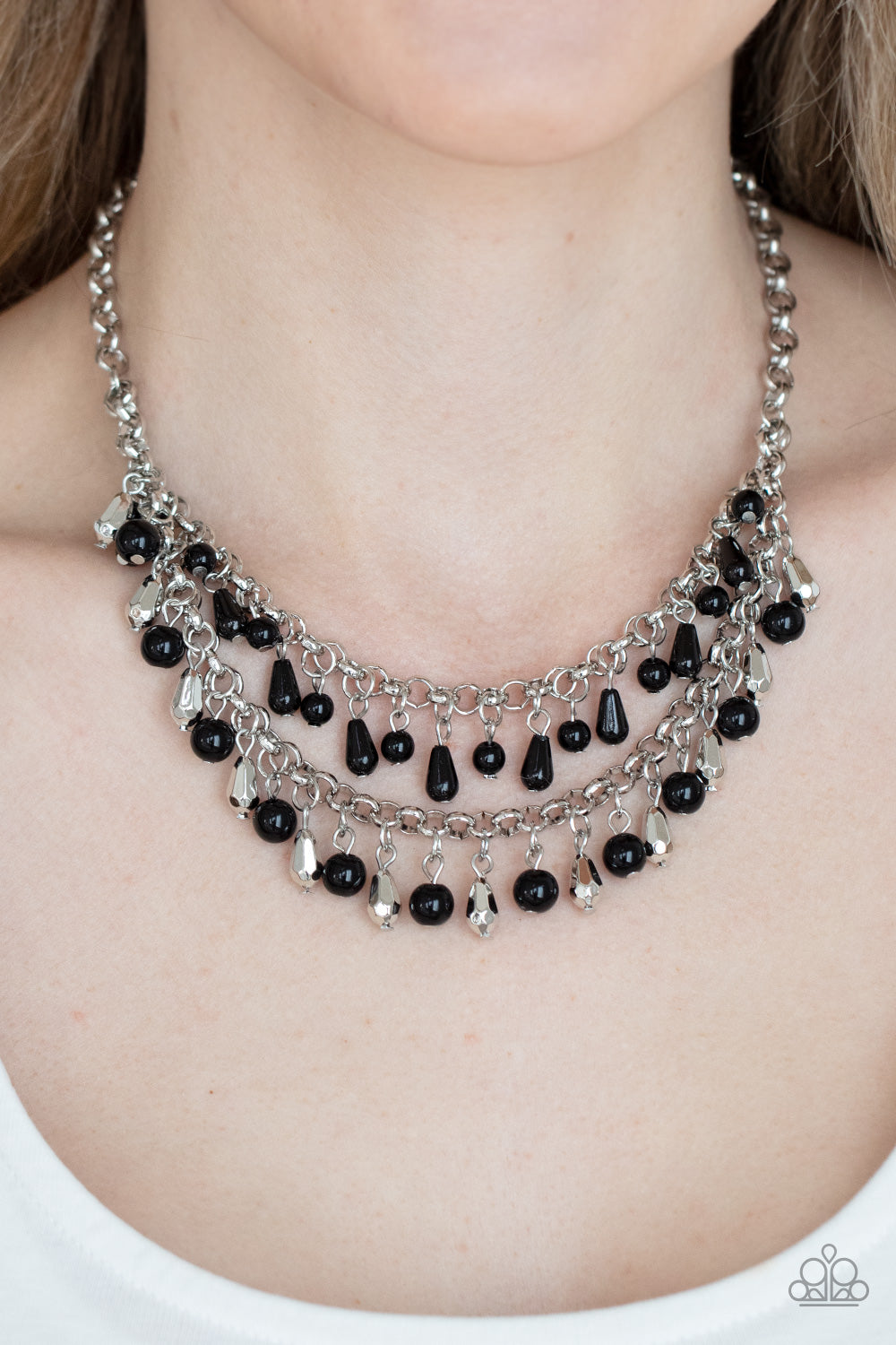 The Big Money Black necklace showcases an elegant mix of sparkling black beads, faceted silver accents, and glossy black teardrop beads arranged along two bold silver chains, forming a playful fringe beneath the collar. It offers an adjustable clasp for a customized fit. This set includes one necklace and a coordinating pair of earrings, perfect for adding sophisticated flair to your ensemble.