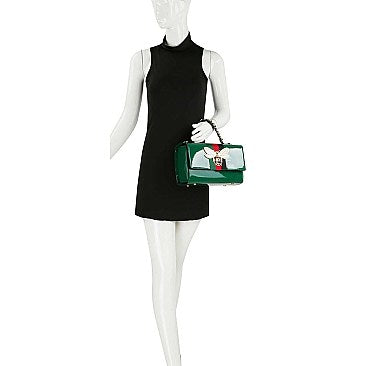 This Queen Bee Stripe Patent Glossy Boxy Satchel Set features a faux vegan leather construction with a magnetic snap closure and gold-tone hardware. The set includes a detachable shoulder strap and functions as a versatile 2-in-1 bag, combining a satchel and wallet. The satchel measures 10.5" L x 7" H x 5" W (4" D), while the wallet is 7.5" L x 4" H x 1" W. Finished with a distinctive Queen Bee accent, this elegant set offers both style and practicality.