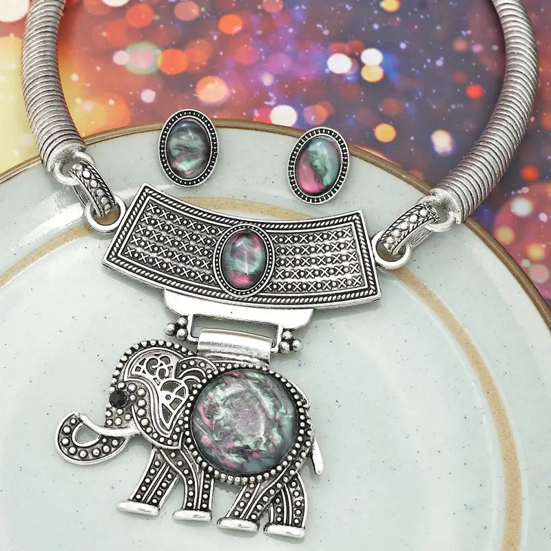 This Vintage Style Elephant Jewelry Set features a pendant necklace paired with stud earrings, embodying a boho chic aesthetic.